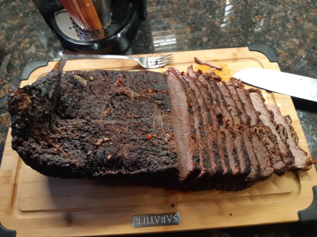 I've done one about 15 yrs ago and from what I remember, turned out really, really dry. Thinking I know a little bit more this go around, I injected the 10 pounder with some beef broth overnight and gave it a dry rub of garlic and onion powder, paprika, chilli powder, salt, bl pepper and some chilli flakes. Smoked it for 6hrs on oak, at 90C, with the fat cap up, trimmed initally, then another 2 hrs with the fat cap down. Make a marinade of beef broth, beer, roasted garlic and some of the remanining dry rub. Put the brisket in the marinade, covered it up, turned the temp up to 140C, and left it there for another 2 hrs, till the internal temp reached 90C. Let it rest for an hr and it turned out nice and juicy, with a lot of flavour. Certainly will be doing this again but with other spices/flavours.