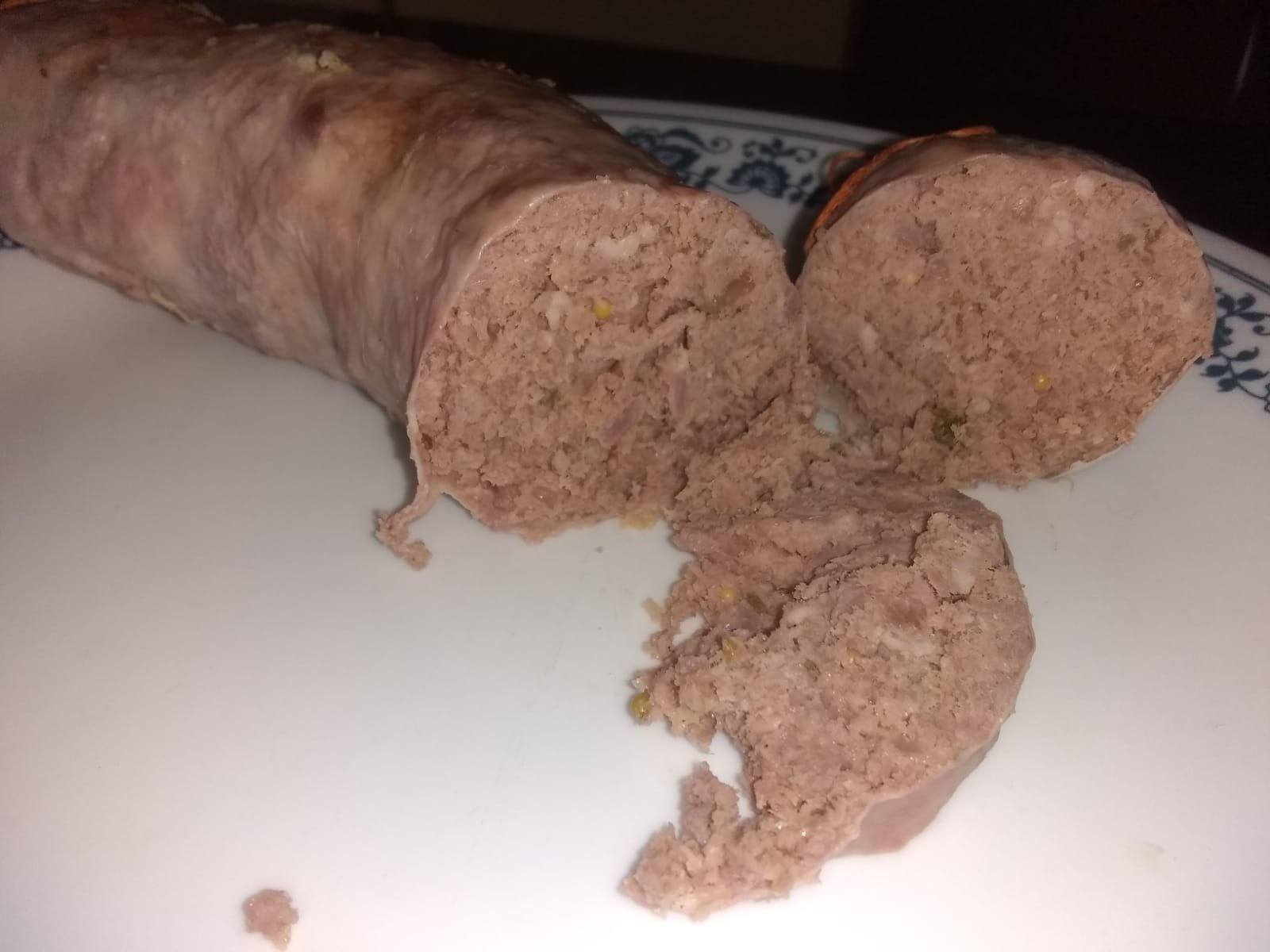- The sausage has a great flavor... that was 1 point for me. But look pale and it falls apart when I cut it or press it with my fingers. At this point I thought I had it coming because I dind't mix long enough.