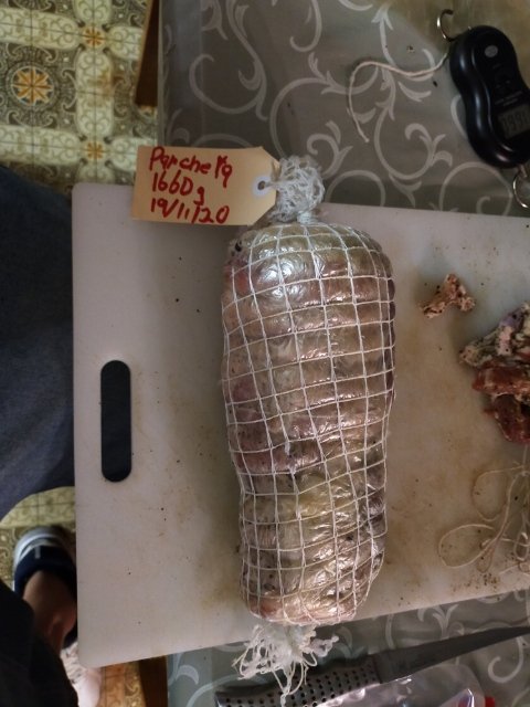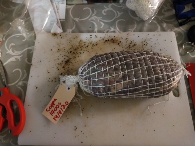 Couple more goodies for chamber. Coppa and nuther panchetta arrotalata. This time i rolled belly opposite way short fat rather than long thin. Will see how that works out..hope to order my ph meter next week get some more salami happening. @Cajuneric your buffulo hot wings salami is a winner!!