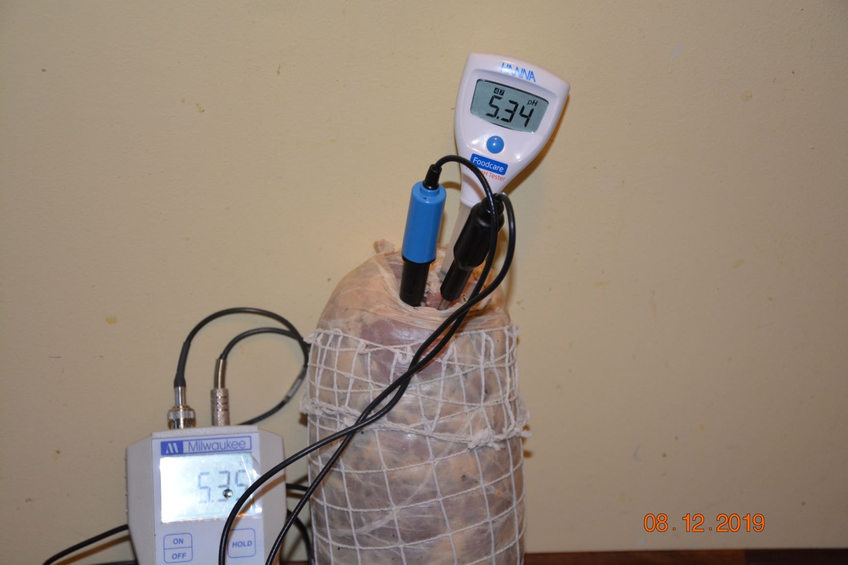 36 hours - pH 5.34-5.35 48 hours - pH - 5.01. Pieces removed to colder garage - 8*C (47-48 F) and 90% humidity