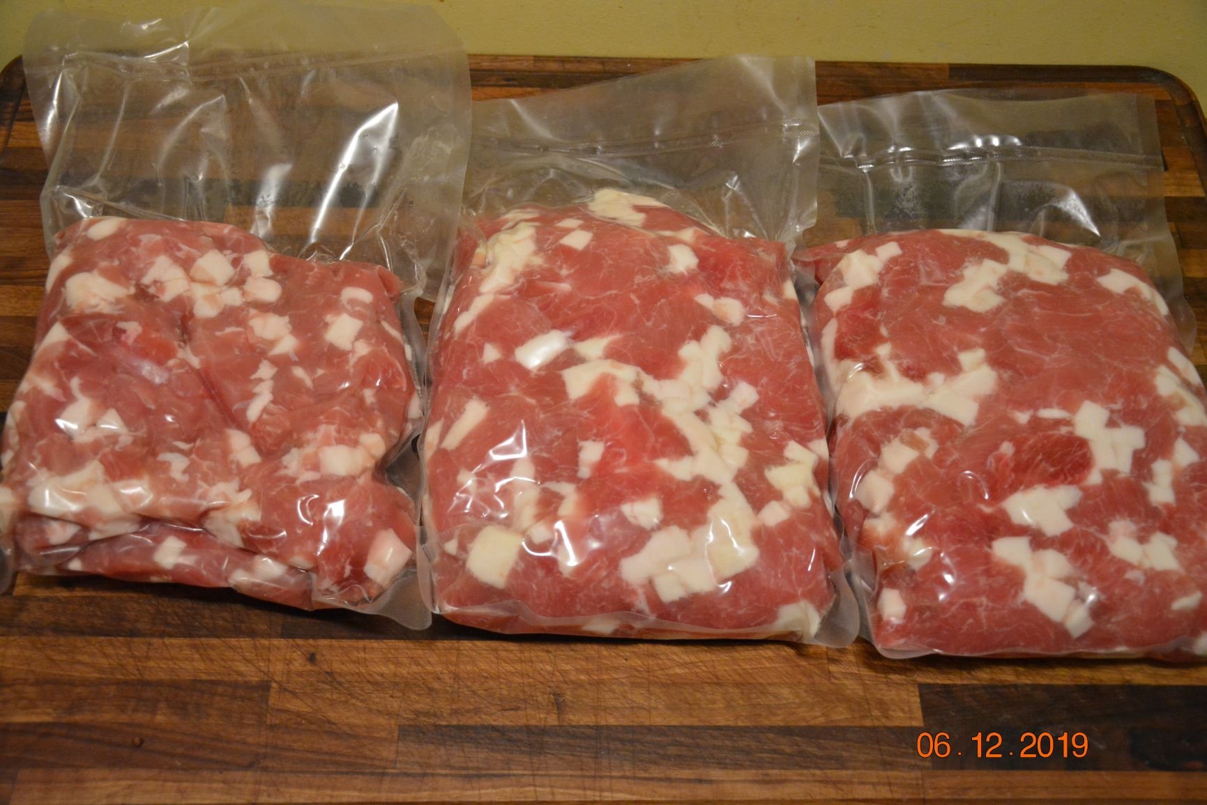 Meats cubed in egg size, salt and cure added - vac pack and left 48 hours in refrigerator.