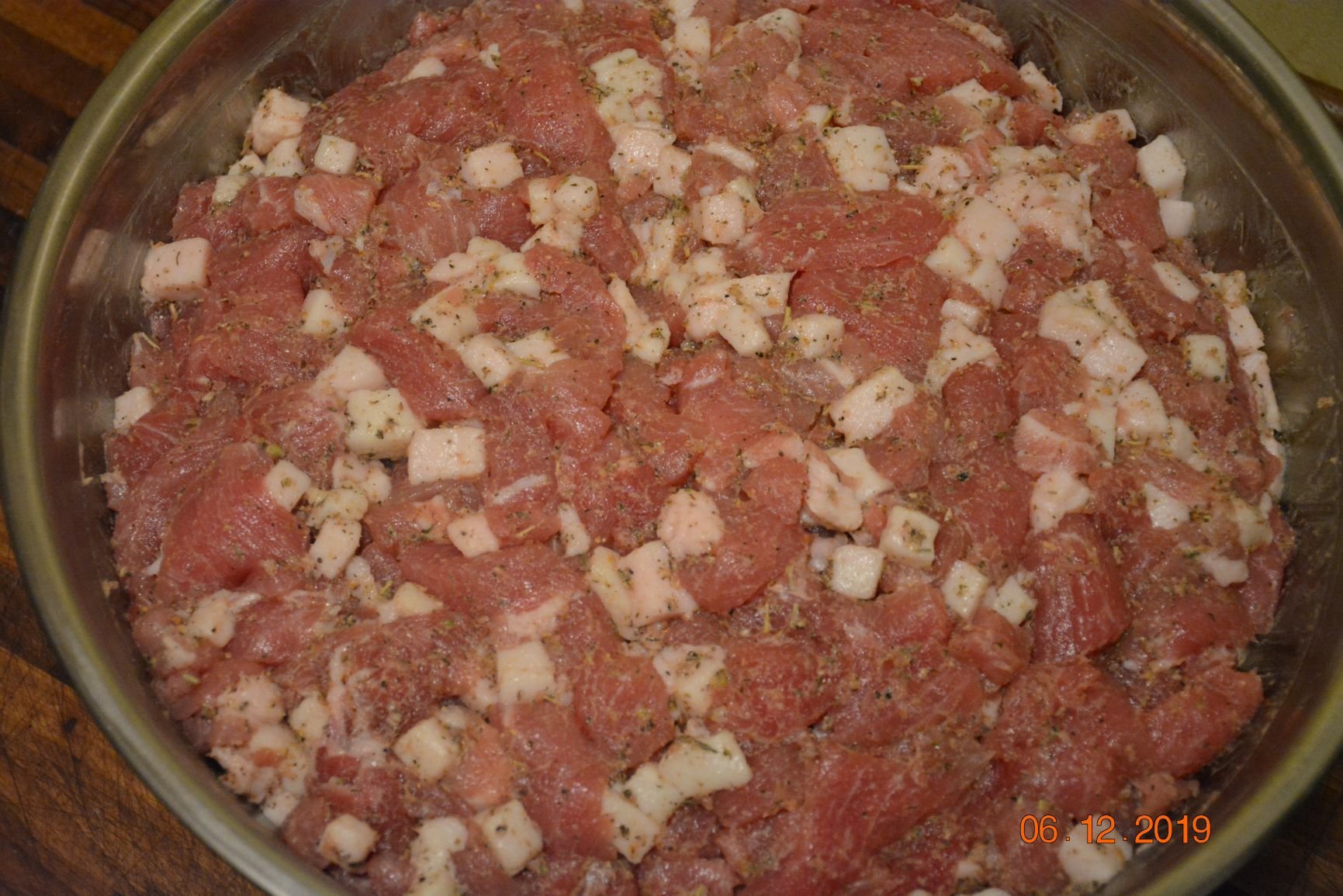 cubed pork loin meat + cubed fat back - cure #2 2.25 g +salt 22.5 g/kg (cured for 72 hours in vac-pack - refrigerator)