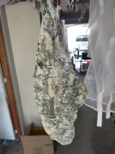 At 32% i cut into it. Waaaaay to wet. Was bone in No sign of rot or bad mold. Would have heen awesome if I left it to 38-40% . Wrapped chunks and will continue drying.