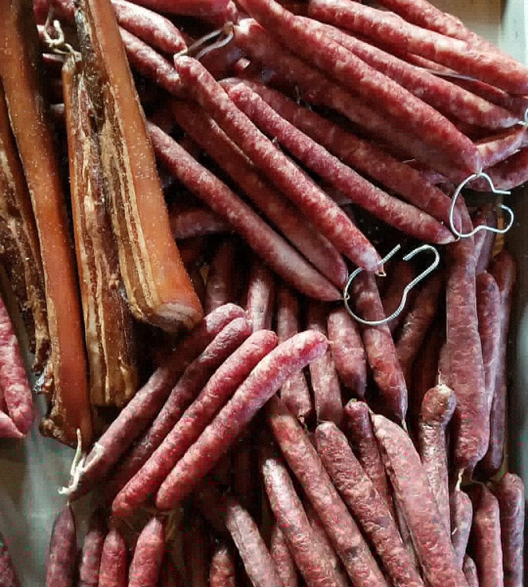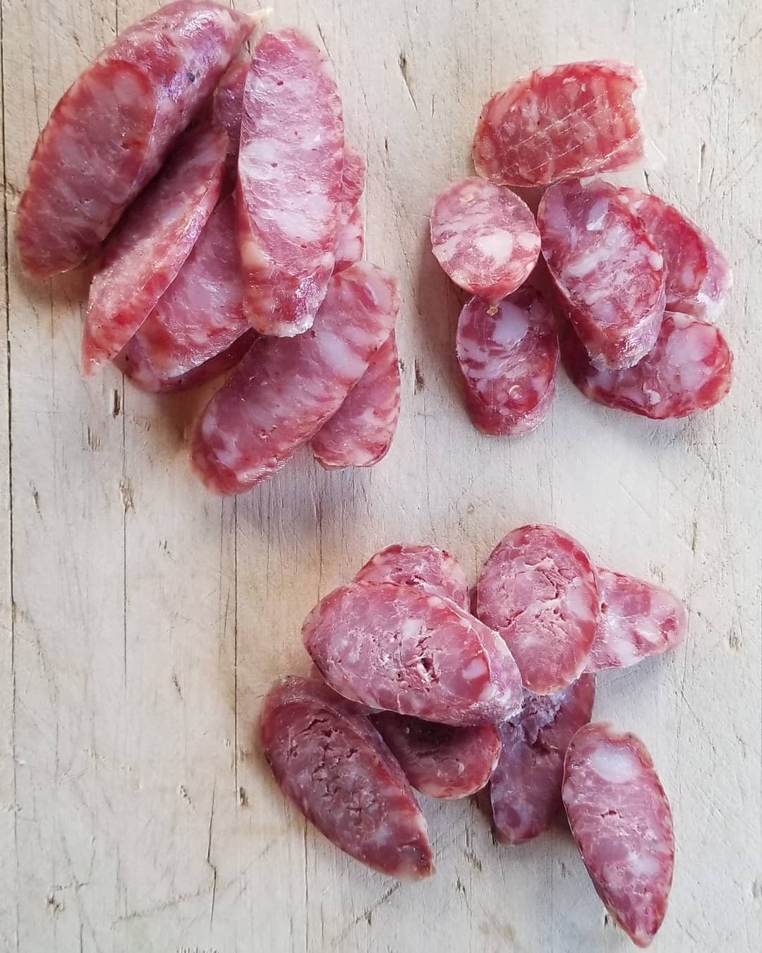 Also, this is a very simple country sausage, quite different than the candy/red/sweet Cantonese/SE Asian Lap Cheong. Traditionally, this would be salted/stuffed and immediately dried at ambient outdoor temp, cool, humid weather, typically. Obviously, no robust fermentation happens then. It is almost always thoroughly cooked.