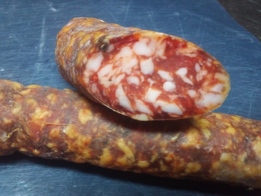 Stuffed in 38-42mm hog casing. Dried to 40% weight loss @ 54-57*F; 80-83% RH%.