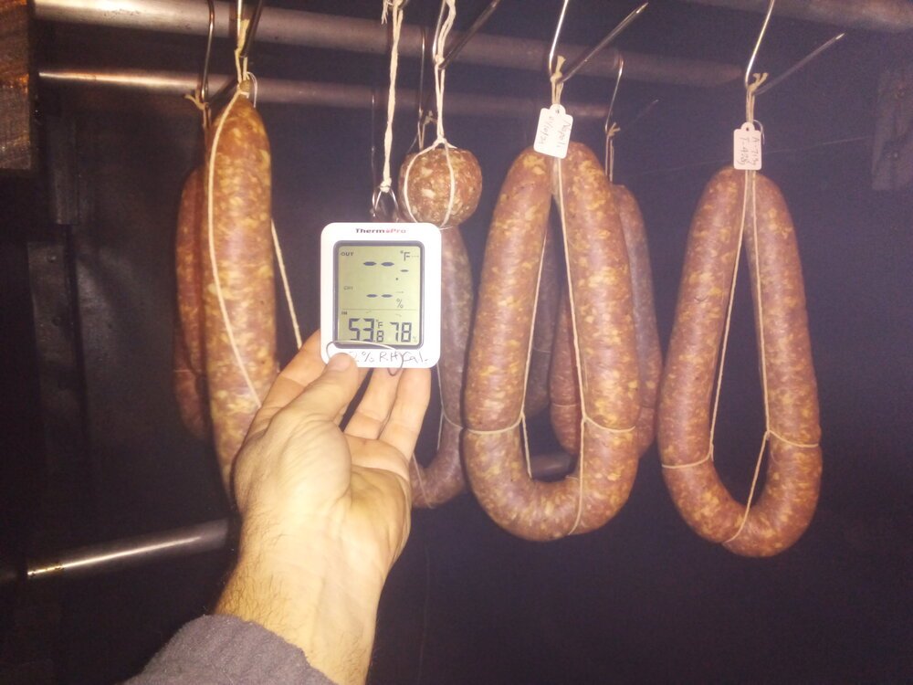 I had just finished cold smoking these salami and as you can see from the pic, the temps were perfect at night...50-59*F; so I hung this salami in the smokehouse at night and then into a regular fridge I use for brining meats and beer during the day. The regular fridge had too much air flow and low RH, but the rest in the smokehouse at night really helped prevent case hardening as it sat with high RH >80%RH and no airflow.