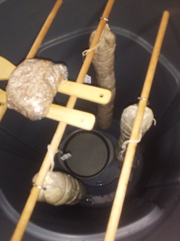 I am now hanging the test piece instead of placing it on top of the poles as when using a heater during winter, the heat rises and it is hottest near the top of the fermentation can lid.....