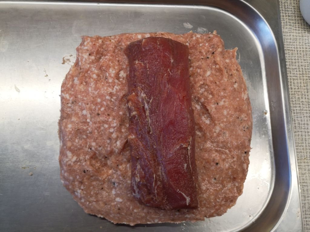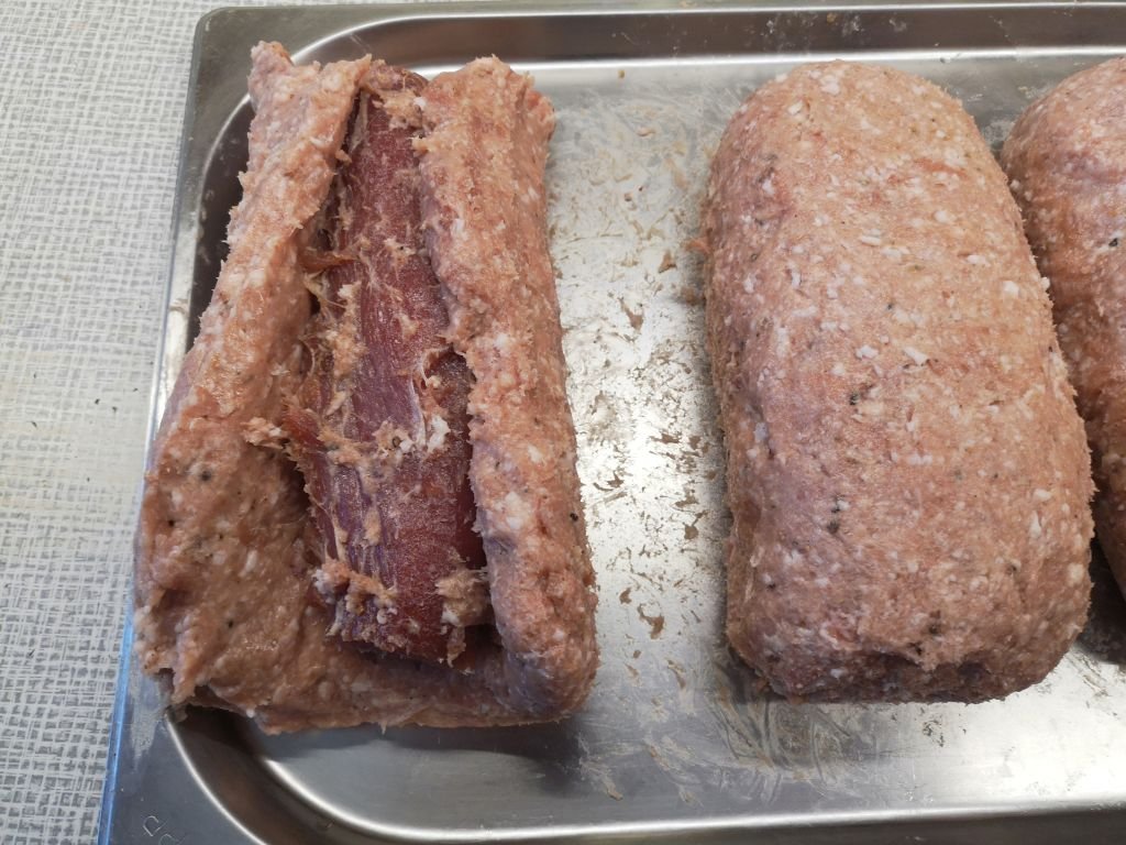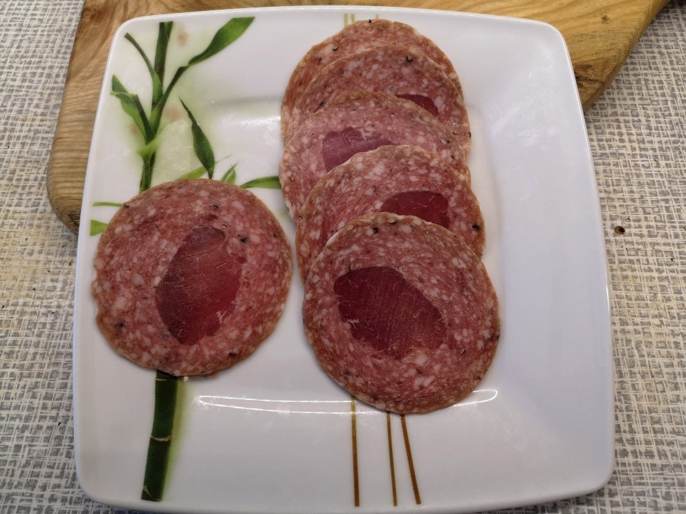 In fact, the salami had thoroughly fused with the tenderloin. If you try to separate it, it tears evenly and the part where the comminuted meat joins the solid muscle stays fully intact. I'd like to confirm that a I didn't use any type of meat enzyme glue, but it did take some work to achieve such a strong bond: