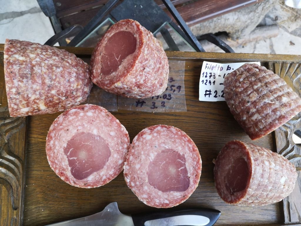 This is my nearly one year old salumi. The colours and the humidity have now levelled out. The combination of both parts: salami + solid muscle exceeded my expectations.