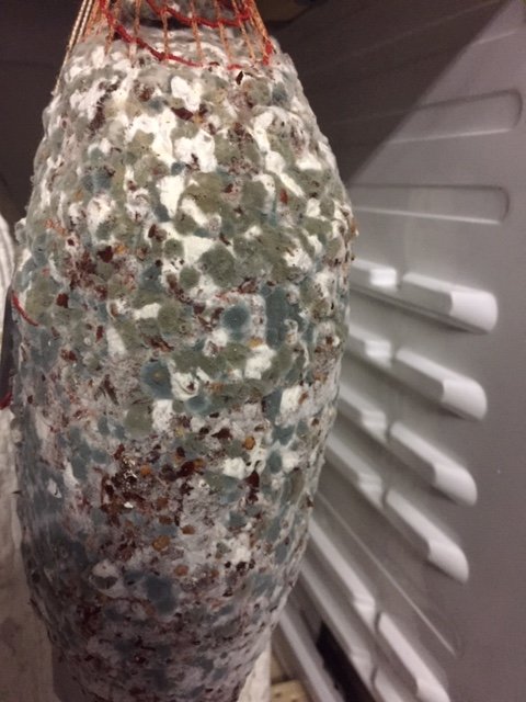 Going by some of the posts I have read here I am not too worried yet, as I think it might be part of the life cycle of the Bactoferm 600 mold my salamis are cased in, or some other benign mold. I was planning on giving the Coppa another day or two to see how it develops before wiping down with vinegar solution if necessary. The mold on my salamis is a white as snow. Could the green mold be coming from the paprika, coriander or chilli in the rub, or the netting?
