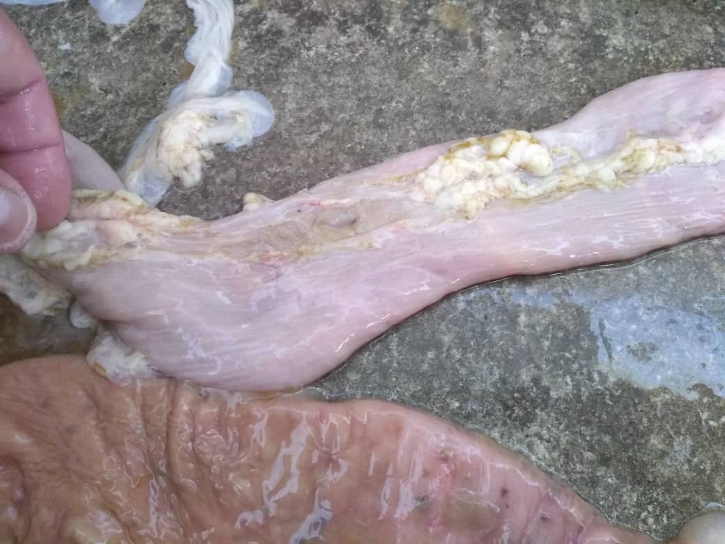 3- Found some black spots in the inside 2 of the bungs. The spots are black, tough and if I prick it or press it with my fingers (like a pimple), somethin yellow popped out. It made me think that maybe both animals were not healthy and that I should not use those casings, but I thought of asking you guys who do know about this. If I scrap these spots they go away but they do leave an almost impercetible black mark and also, to scrap them off I have to put a bit of force on the knife.