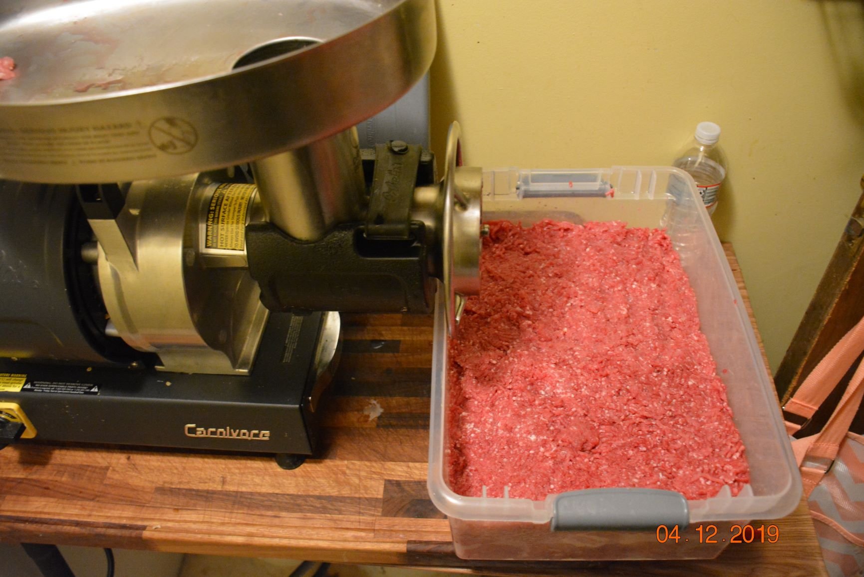 After that time - meats were put in box by layer (lean meat on battom, pork belly, Grounded beef by plate 3 mm, then frozen fat)
